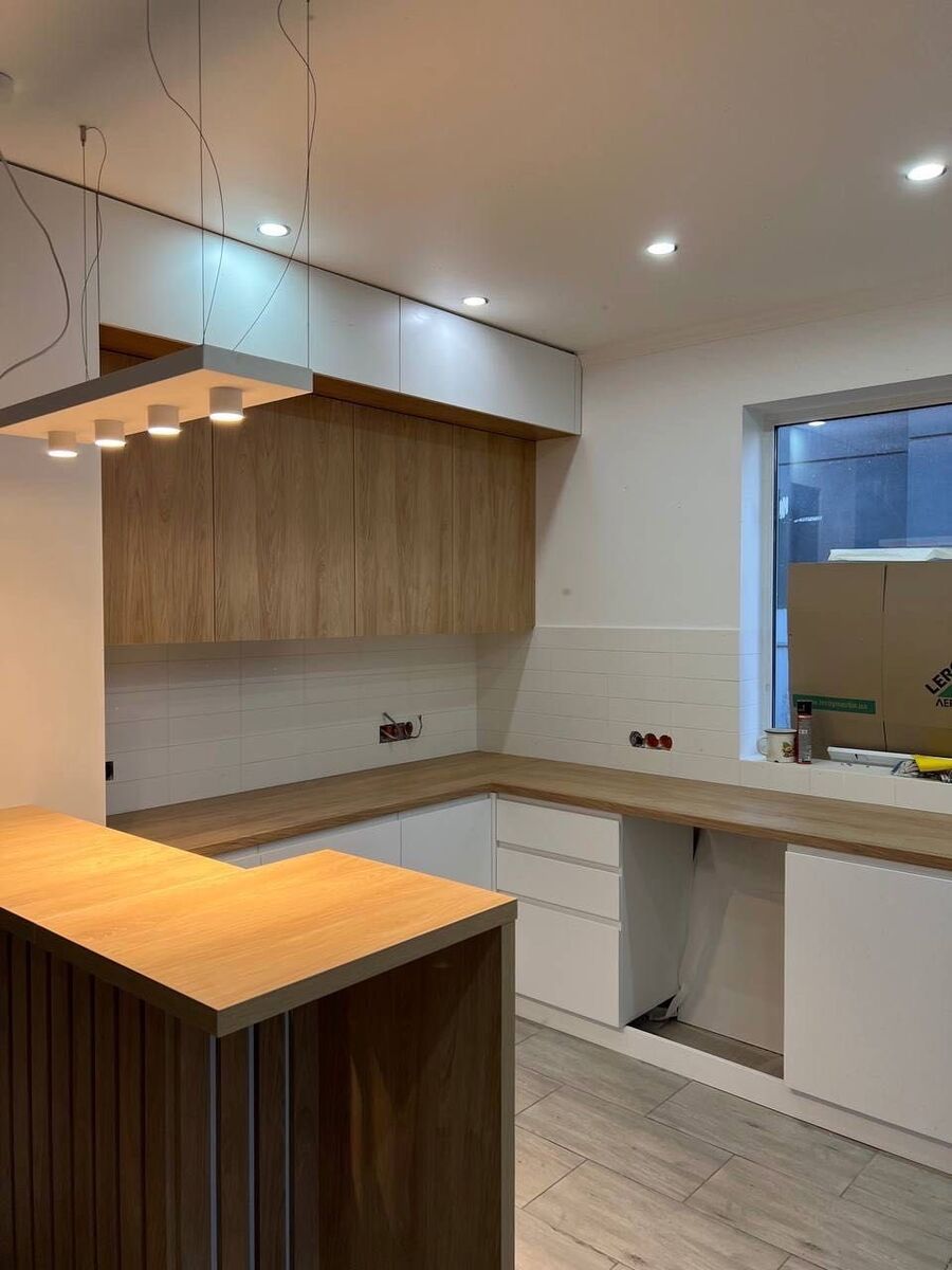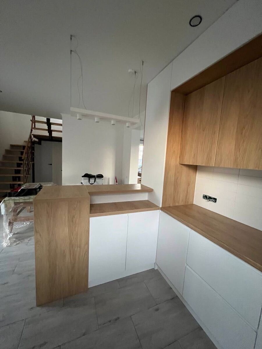Кухня 20.8 кв.м. повністю обладнана всієї вбудованою технікою (на фото не вся техніка). З Кухні є вихід на терасу. Тераса ще не готова.