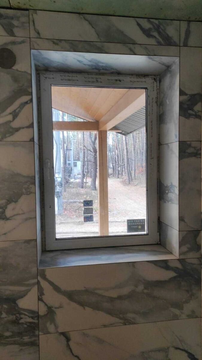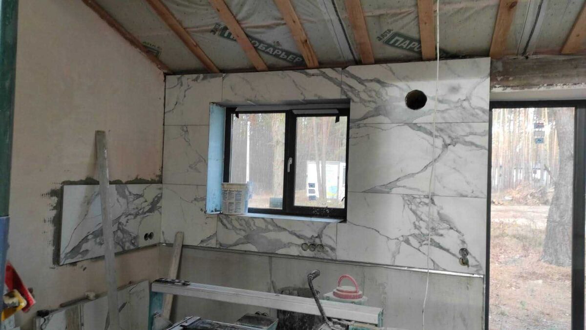 Внутрішні роботи: залиті підлоги, розведена електрика та вода, покладена мармурова плитка у ванній кімнаті, кухні, зроблений камін на 15 кВт. Стіни поштукатурені під фарбування у вітальні та коридорі. Куплені венілові підлоги.