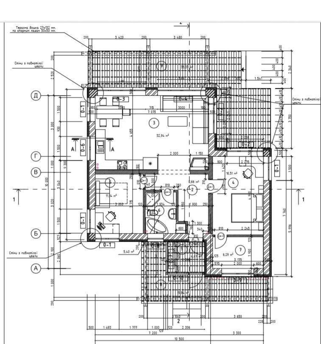 Одноповерховий будинок, площею 135 метрів с критими терасами. Збудований по ексклюзивному проекту з дотриманням усіх будівельних норм.