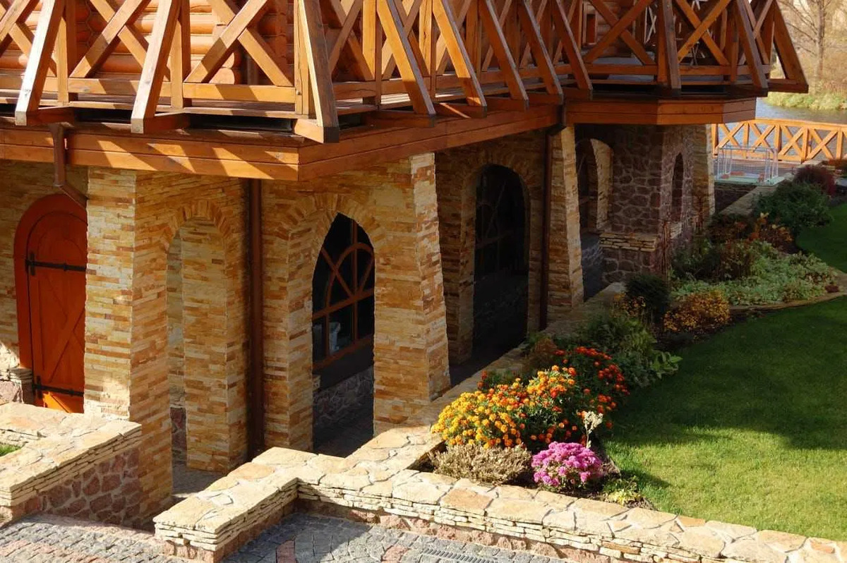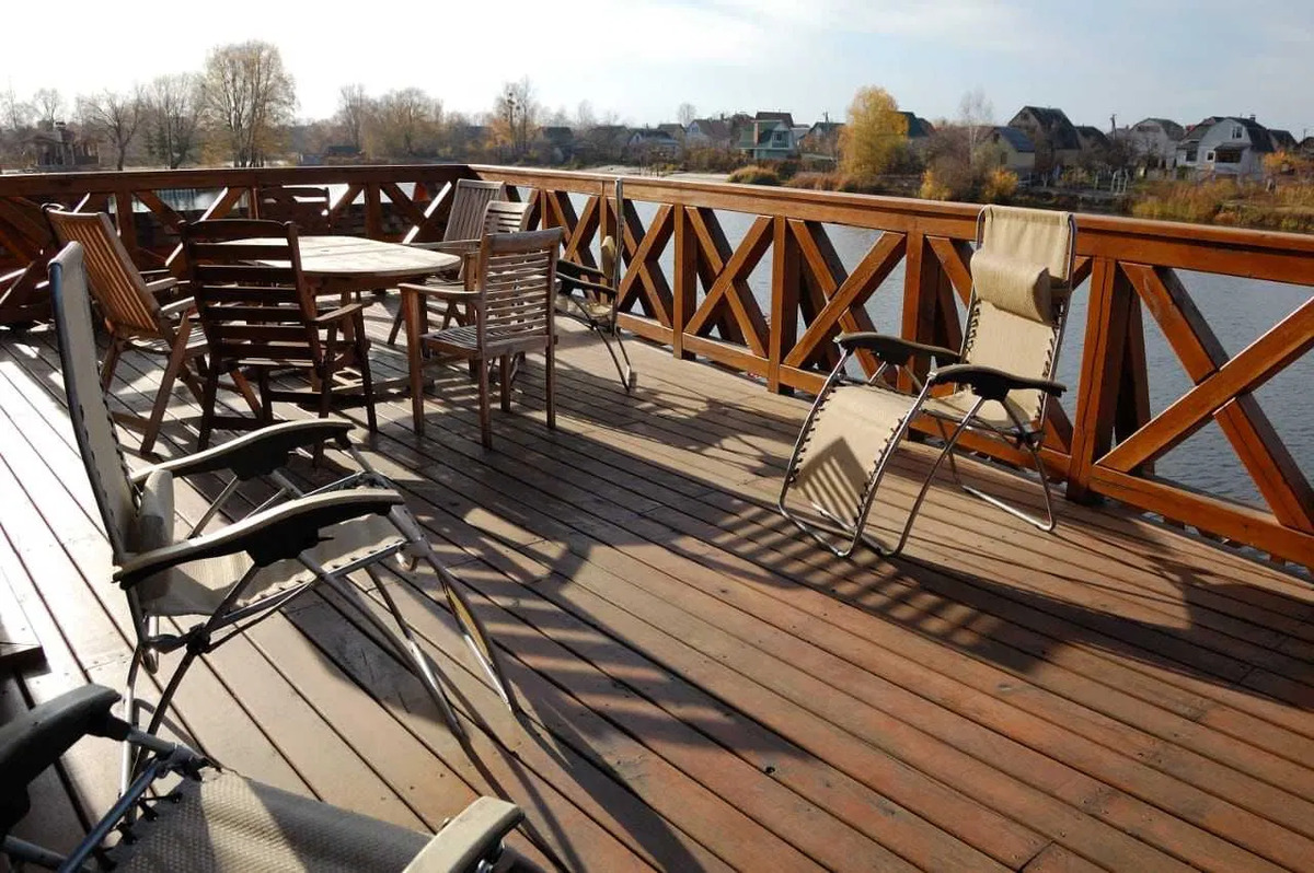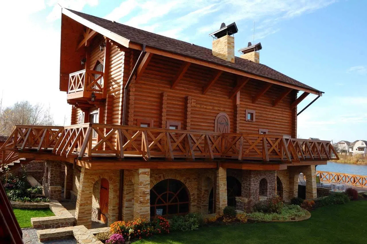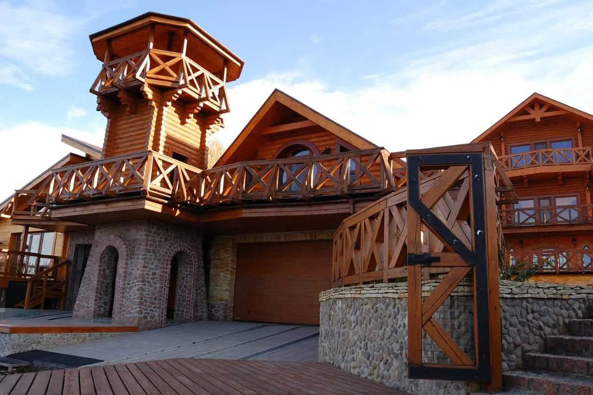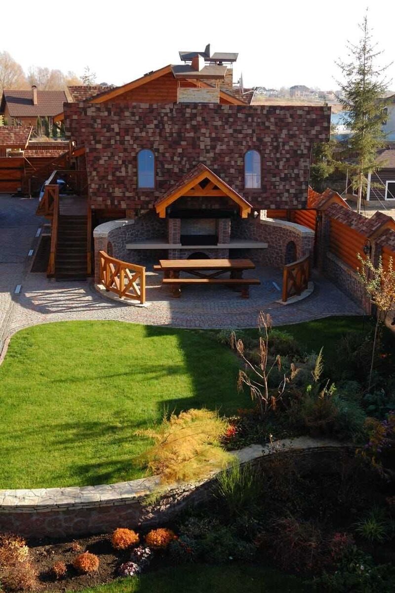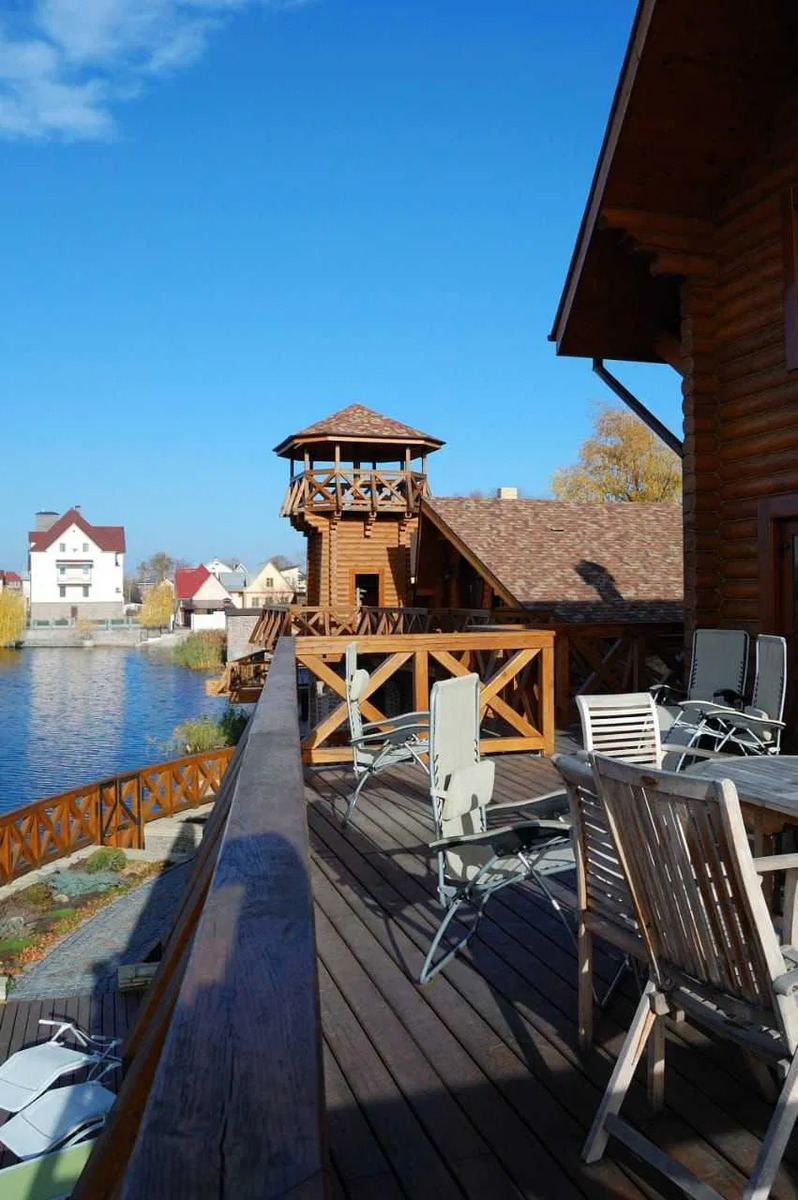 5) Приміщення для зберігання та ремонту катера (елінг). Будинок розташовано на закритій території, що охороняється. Вихід із ділянки на Дніпро, свій причал, елінг. При будівництві використоваувалися Тільки натуральні будівельні матеріали - дерево смереки, ялиці, дуба. Мармур. У будинку ніхто не жив, все нове. Система автономного тепло-, водо- та електропостачання..