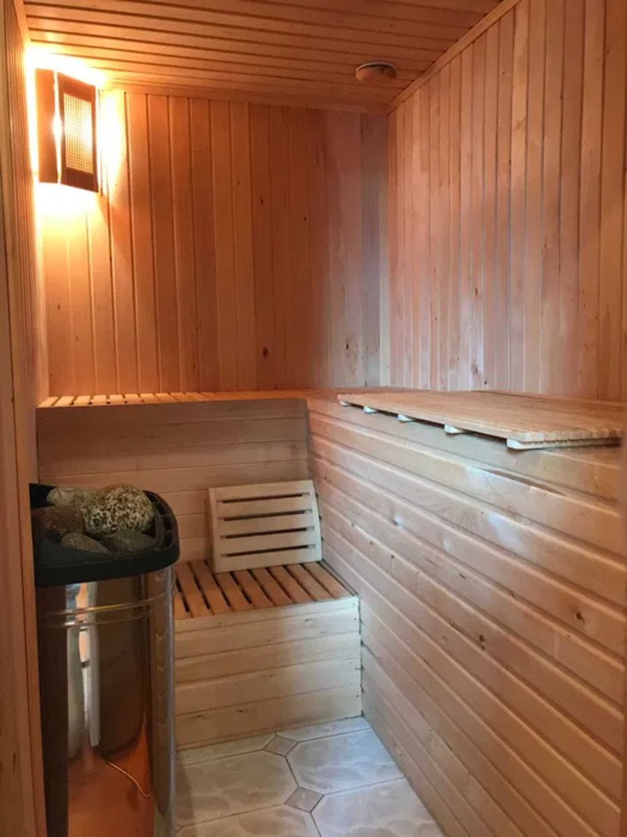 1 этаж: Гостиная с КАМИНОМ, столовая с кухней и возможным выходом на крытую ТЕРРАСУ с БАССЕЙНОМ, САУНА(электр.), подсобное помещение, санузел(душ,туалет), Гардеробная.