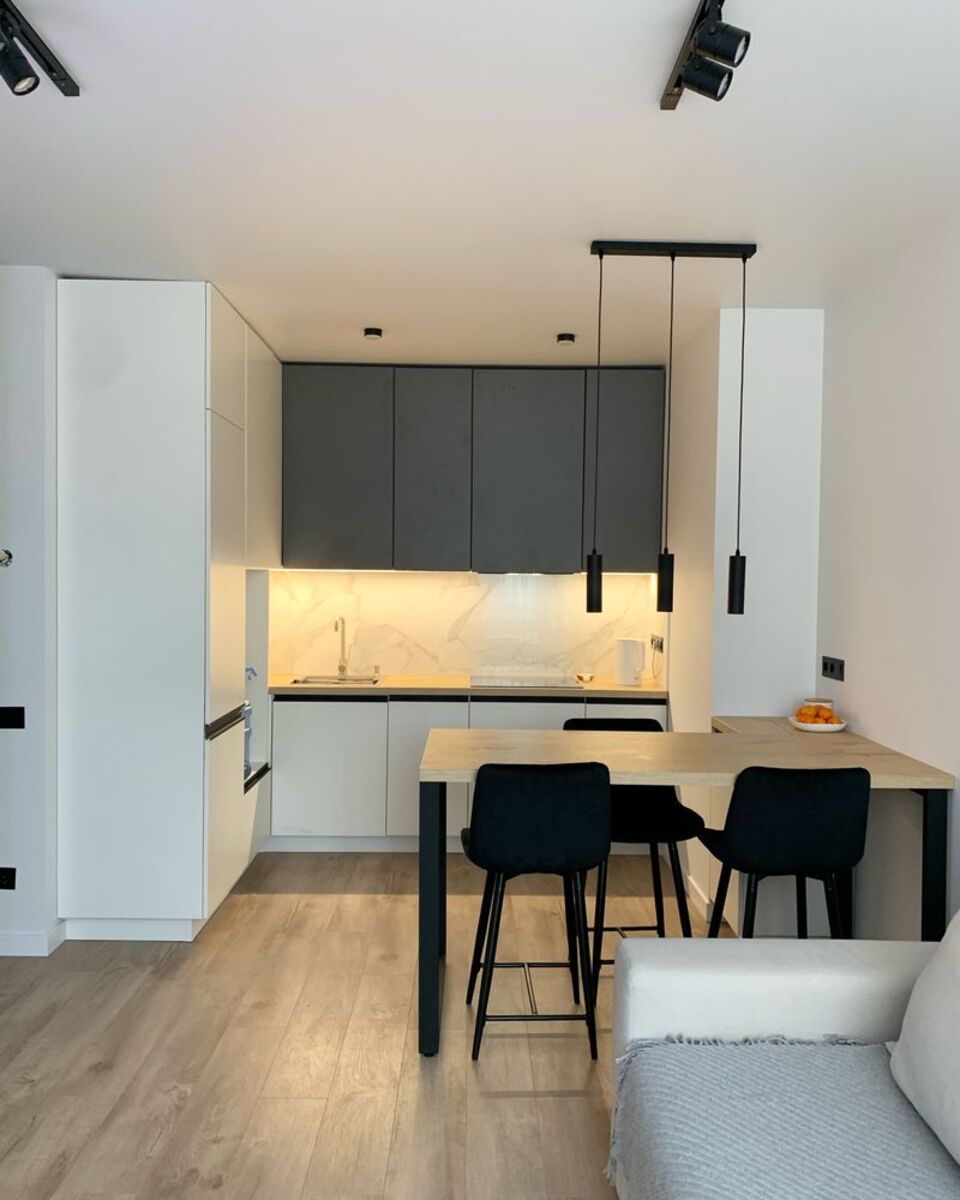 Сучасна система освітлення, вбудована сантехніка, двері прихованого монтажу, безшовна стеля, якісні та зручні меблі.